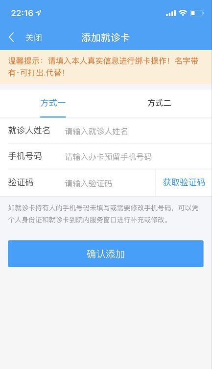 添加就诊卡目前有两种方式,方式一是短信验证,方式二是填写就诊卡相关信息。