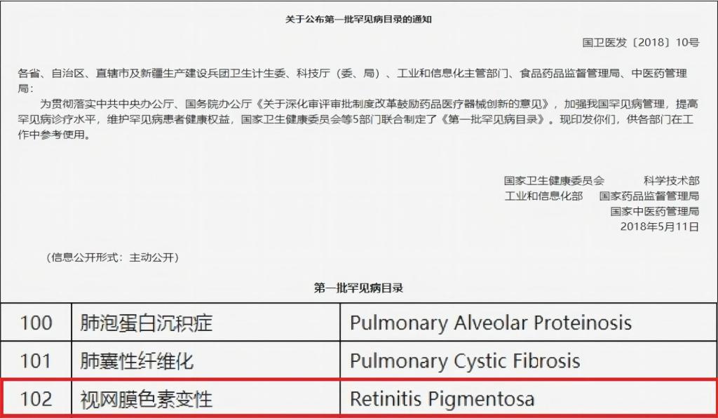 原发性视网膜色素变性(retinitis pigmentosa,RP),是一种进行性、遗传性、营养不良性视网膜退行性病变,主要表现为慢性进行性视野缺失、夜盲及视网膜骨细胞样色素沉着,最终可导致视力下降。全球患病率约为1/5000至1/3000,患者早期出现儿童期夜盲,随病程发展形成环形暗点并逐渐扩大为管状视野,晚期可伴色觉异常及失明。该病于2018年5月11日被国家卫生健康委员会等五部门联合制定的《第一批罕见病目录》收录。