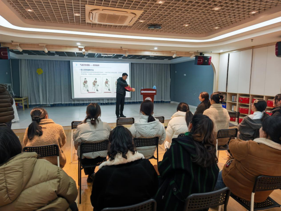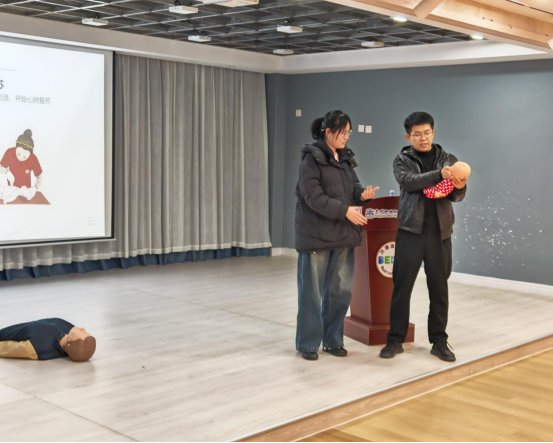 刘军从2022 年我国恶性肿瘤发病及死亡情况数据出发,直观呈现了肺癌、结直肠癌、乳腺癌等高发肿瘤的发病态势,深刻剖析了癌症高发病率、高死亡率、高治疗费用的危害,并援引世界卫生组织权威观点,为大家树立科学防癌的信心;汤佳琪以“心脏骤停黄金 4 分钟”为切入点,强调了院前急救的重要性。在心肺复苏教学中,他详细拆解了人工呼吸的完整流程,并介绍了AED使用的简单流程。此外,汤佳琪还讲解了气道异物梗阻的识别方法及不同人群的海姆立克急救法操作技巧。