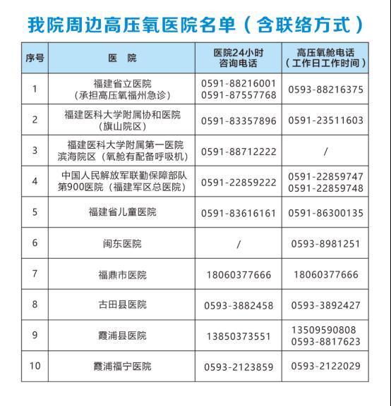为方便患者就近选择其他高压氧舱治疗服务,现提供部分附近医院信息如下(具体服务时间、预约方式及诊疗安排可能动态调整,建议提前电话确认并咨询转诊需求)。