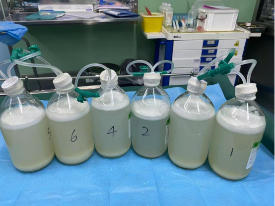 在麻醉科、护理团队的紧密协作下,手术顺利完成。2次治疗共应用20000ml生理盐水进行肺灌洗,灌洗液从最初的“牛奶状”逐渐变得清亮(图3)。 术后,林先生气喘改善明显,氧合指数恢复正常,出院时更是打趣,感觉自己能跑全程马拉松!