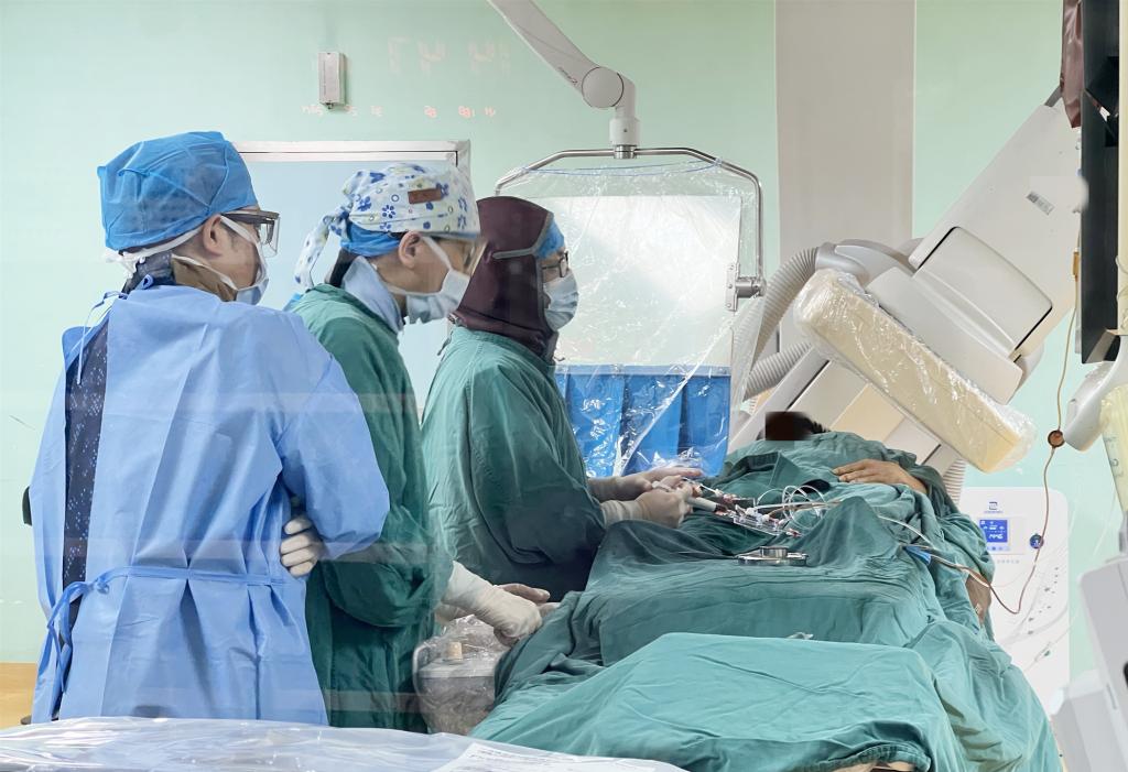 在手术过程中,张治教授凭借精湛的临床技术与丰富的诊疗经验,结合术中患者特殊情况,熟练运用微导管无法通过的导丝裸行旋磨技术、锥形头微导管旋转穿通术以及振波球囊成形术等前沿介入技术,精准处理血管钙化及闭塞病变,一步步打通堵塞的心脏血管。我院心血管内科医护团队密切配合、全程观摩学习,手术全程平稳顺利,四例手术均取得圆满成功,术后患者血管血流恢复通畅,生命体征稳定,目前均在稳步康复中。
