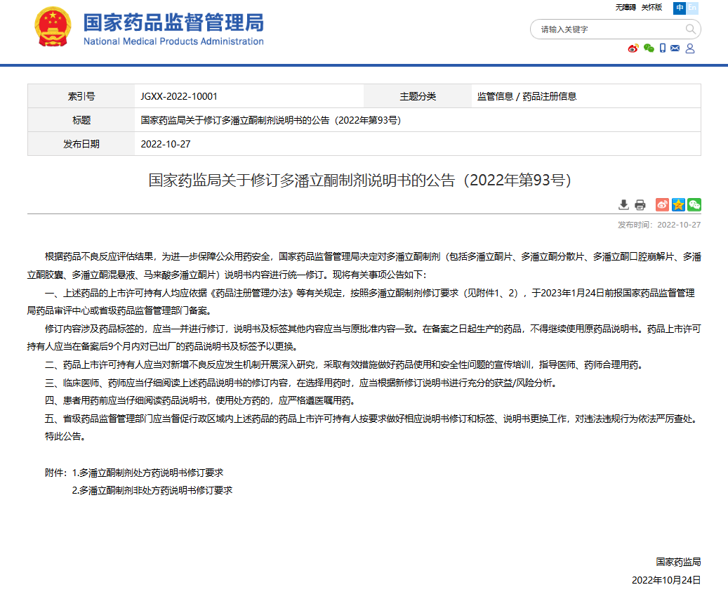 国家药监局关于修订多潘立酮制剂说明书的公告(2022年第93号)