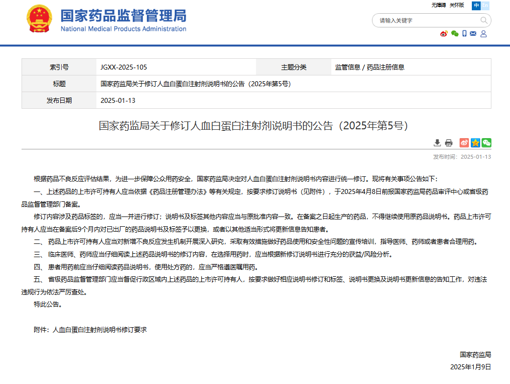 国家药监局关于修订人血白蛋白注射剂说明书的公告(2025年第5号)