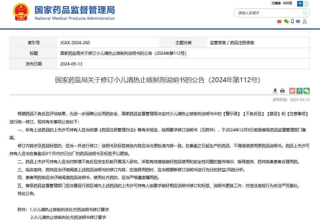 国家药监局关于修订小儿清热止咳制剂说明书的公告(2024年第112号)