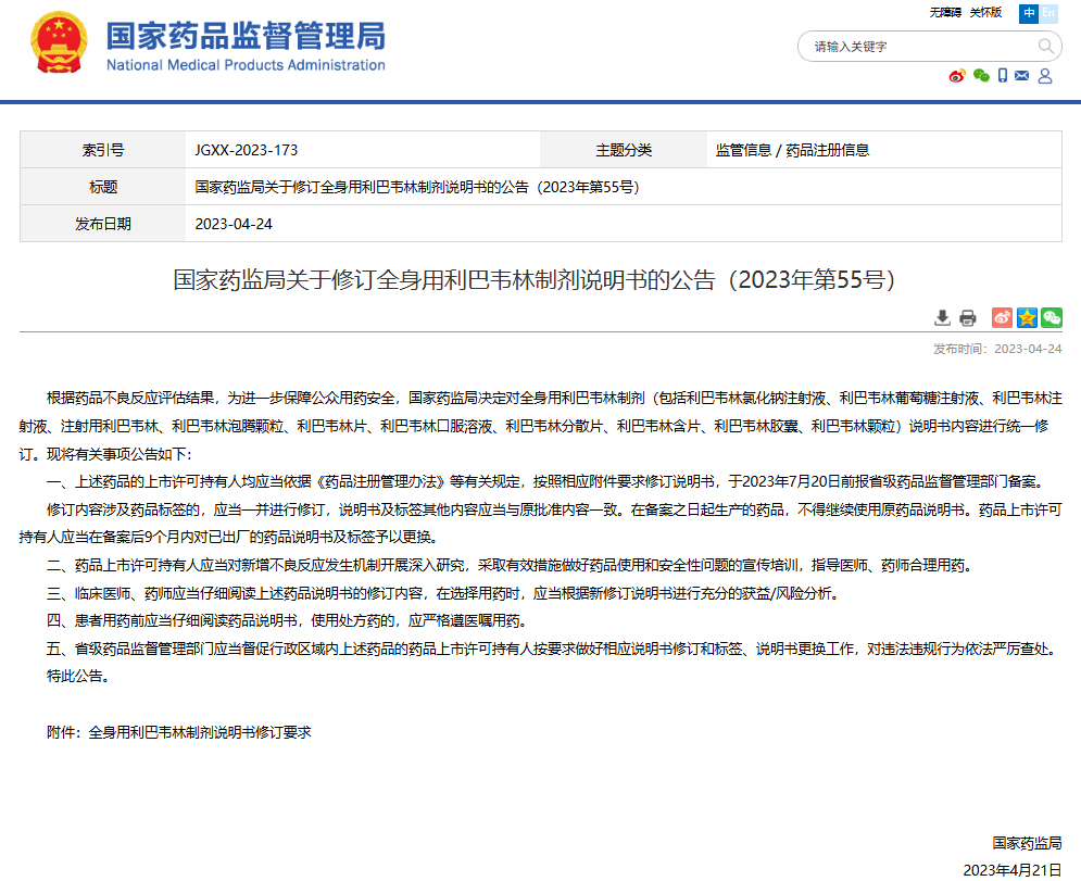 国家药监局关于修订全身用利巴韦林制剂说明书的公告(2023年第55号)