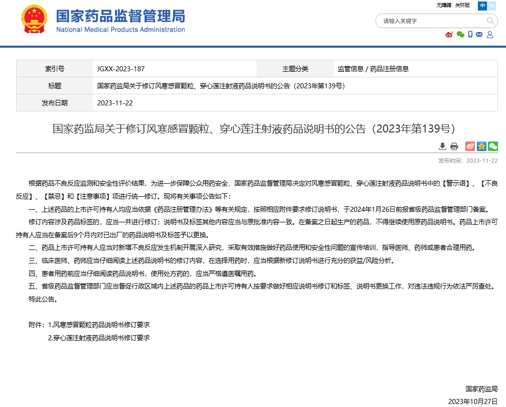国家药监局关于修订风寒感冒颗粒、穿心莲注射液药品说明书的公告(2023年第139号)